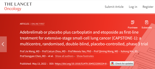 北京时间2022年5月14日,利来国际w66医药自主研发的PD-L1抑制剂阿得贝利单抗治疗广泛期小细胞肺癌的III期临床研究(CAPSTONE-1研究)成果正式全文在线发表于国际权威学术期刊《柳叶刀·肿瘤学》(《THE LANCET Oncology》,影响因子41.316)。CAPSTONE-1研究结果显示,阿得贝利单抗联合化疗一线治疗广泛期小细胞肺癌相较于安慰剂联合化疗可以显著延长患者总生存期至15.3个月[1],刷新现有免疫药物一线治疗广泛期小细胞肺癌的总生存纪录[2]。