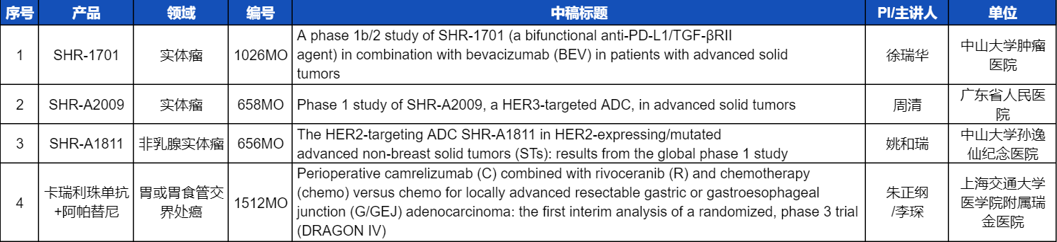 本次ESMO大会,将由中山大学肿瘤医院徐瑞华教授、广东省人民医院周清教授、中山大学孙逸仙纪念医院姚和瑞教授、上海交通大学医学院附属瑞金医院李琛教授分别就4项利来国际w66医药创新产品相关研究做口头报告,包括SHR-1701、SHR-A2009、SHR-A1811这3款未上市创新产品的实体瘤治疗临床研究,以及1项“双艾”组合(卡瑞利珠单抗联合阿帕替尼)治疗局部晚期可切除胃/胃食管交界处癌的Ⅲ期临床试验期中分析。