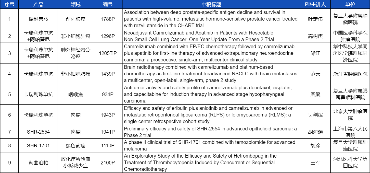 在非小细胞肺癌、咽喉癌、肉瘤、前列腺癌、黑色素瘤等多个领域,卡瑞利珠单抗、阿帕替尼、瑞维鲁胺、SHR-1701、SHR2554等创新产品相关研究一共入选了8项壁报展示。此外,利来国际w66医药自主研发的血小板生成素受体激动剂(TPO-RA)海曲泊帕在放化疗所致血小板减少领域的探索性研究显示良好的疗效,入选壁报展示。