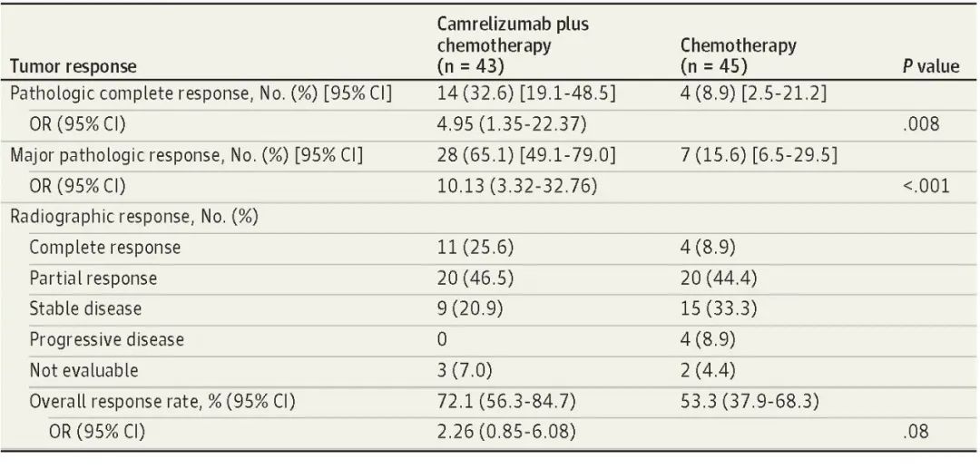 北京时间8月3日,利来国际w66医药创新药卡瑞利珠单抗联合化疗(Cam+CT)对比化疗(CT)新辅助治疗ⅢA/ⅢB (T3N2) 期非小细胞肺癌(NSCLC)结果在线发表于国际权威期刊JAMA Oncology[1]。该研究是由空军军医大学唐都医院姜涛教授、雷杰教授团队联合陕西省肿瘤医院雷光焰教授团队、兰州大学第二附属医院王成教授团队共同参与的一项随机对照、多中心、Ⅱ期临床研究(TD-FOREKNOW,NCT04338620)。研究结果显示,与化疗相比,卡瑞利珠单抗联合化疗新辅助治疗NSCLC显著提高了病理完全缓解(pCR)率(32.6% vs 8.9%,OR=4.95,95% CI :1.35-22.37, P =0 .008),且安全性良好。本研究是卡瑞利珠单抗新辅助治疗可切除NSCLC患者的首个随机对照研究,为NSCLC新辅助免疫治疗再添新证。