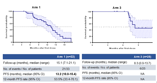 截至2024年12月31日,队列A中Arm 1(单药组)入组33例患者,Arm 3(联合组)入组25例患者,中位随访时间分别为15.1个月和8.3个月。